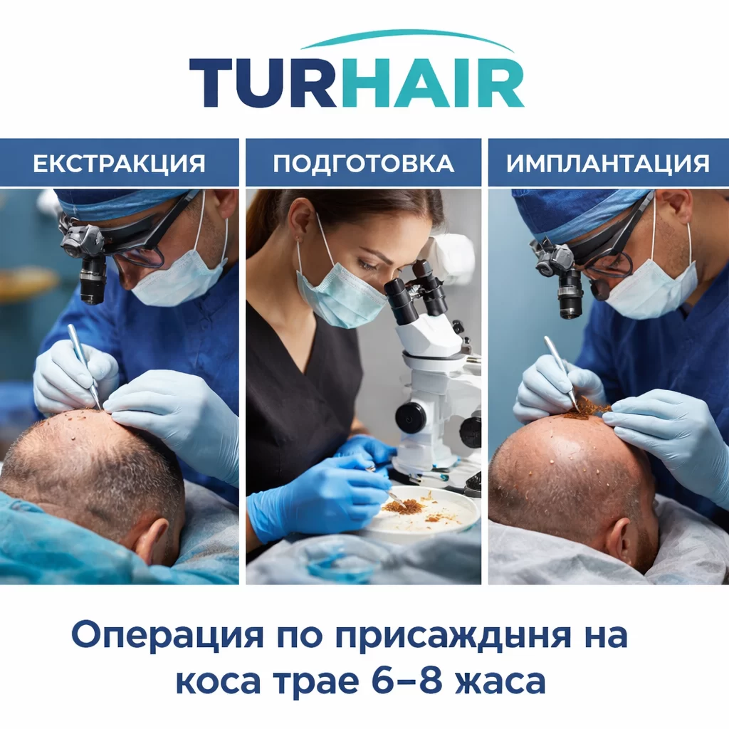 Операцията по присаждане на коса трае средно между 6 и 8 часа, като точната продължителност зависи от броя графтове, техниката и участието на лекаря в ключовите етапи.